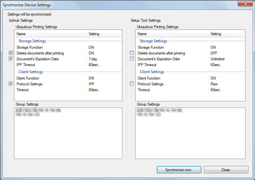 Anschließend werden die Universaldruckeinstellungen von LK-114_SetupTool und des MFP sowie die Kontrollkästchen aller Elemente, deren Einstellungen voneinander abweichen, angezeigt.