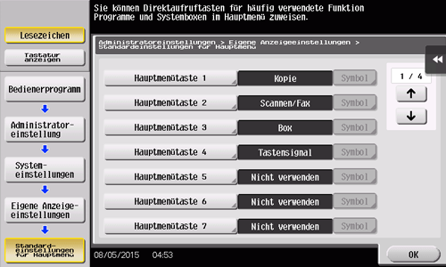 Tippen Sie auf [Bedienerprogramm] - [Administratoreinstellungen] - [Systemeinstellungen] - [Eigene Anzeigeeinstellungen] - [Anzeigeeinstellungen für Hauptmenü].