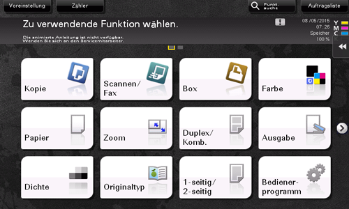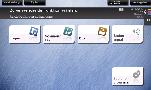 1 | Hauptmenütasten | Anzeige der den verschiedenen Funktionen zugewiesenen Direktaufruftasten. Die Direktaufruftasten können frei an Ihre individuellen Anforderungen angepasst werden. Standardmäßig wird im Hauptmenü [Kopie], [Scannen/Fax], [Box], [Tastensignal] und [Bedienerprogramm] angezeigt. ([Bedienerprogramm] ist fest voreingestellt.)