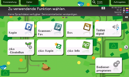 Wenn [Öko-Einstellung], [Öko-Kopie] oder [Öko-Info] im Hauptmenü platziert wird, wechselt der Hintergrund des Hauptmenüs zum Hintergrund der Öko-Funktion.