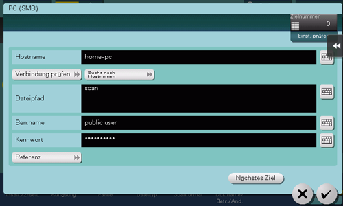 [Referenz] | Suchen Sie im Touch Display nach einem Ziel-Computer für den Dateiversand und wählen Sie einen freigegebenen Zielordner aus. Wenn der Authentifizierungsbildschirm angezeigt wird, geben Sie den Namen und das Kennwort eines Benutzers an, der die entsprechenden Rechte für den Zugriff auf den ausgewählten Ordner besitzt. Nach der Authentifizierung wird der [Hostname] oder der [Dateipfad] automatisch eingetragen. Unter den folgenden Bedingungen kann die Referenzfunktion fehlschlagen.