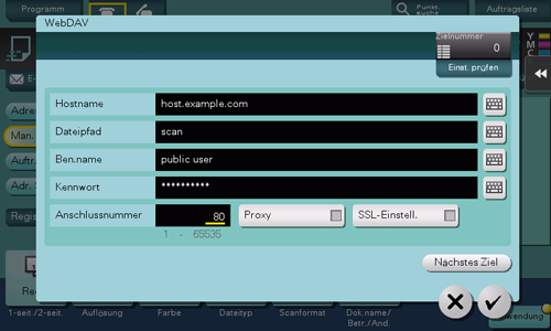 Geben Sie einen WebDAV-Server-Hostnamen bzw. eine IP-Adresse als Ziel an, wenn gescannte Originaldaten an einen WebDAV-Server gesendet werden sollen.