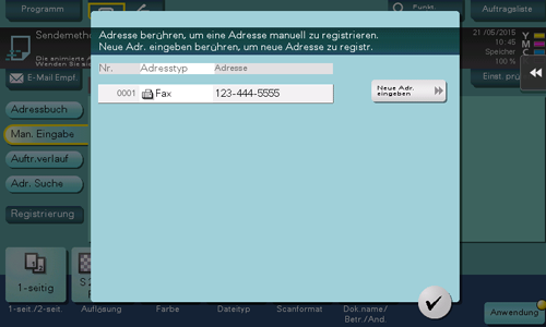 Bei Bedarf können Sie das manuell eingegebene Ziel im Adressbuch registrieren. Ausführliche Informationen zur Registrierung finden Sie Hier.