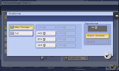 [Metr. Formate] | Wenn Sie ein Großformatpapier mit einem metrischen Format in Magazin 1 bis Magazin 4 einlegen, wählen Sie das Papierformat aus. |