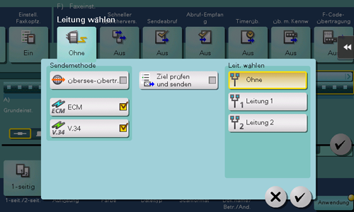 [Leitung wählen] | Bei Verwendung mehrerer Telefonleitungen wählen Sie die zum Senden von Faxdokumenten verwendete Leitung aus. In der Regel wird [Leitung 1] verwendet. Wenn [Nein] angegeben wird, wird eine beliebige freie Leitung für die Übertragung verwendet. |