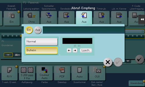 [Bulletin] | Wählen Sie diese Option, um eine in einer Abrufbox gespeicherte Datei zu empfangen. Geben Sie die Boxnummer der Bulletin-Board-Box auf dem entsprechenden Zielsystem über die Tastatur ein. Tippen Sie zur Anzeige der Tastatur auf den Eingabebereich für Zahlen. |