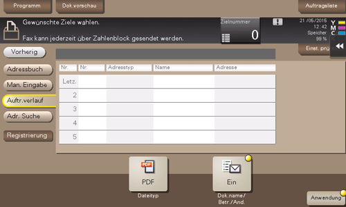 Tippen Sie auf [Auftr.verlauf], um ein Ziel aus dem Scan- oder Faxverlauf auszuwählen. Die letzten Aufträge (max. 5) werden im Verlauf angezeigt. Bei Bedarf können mehrere Ziele aus dem Verlauf ausgewählt werden.