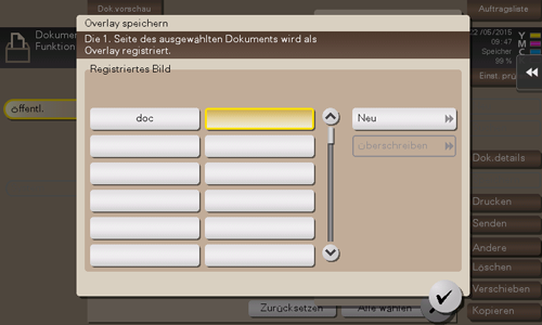 Speichern Sie eine Datei als Overlay-Bild. Nach der Registrierung können Sie während des Kopierens oder Druckens ein Overlay-Bild auf dem Original erstellen.