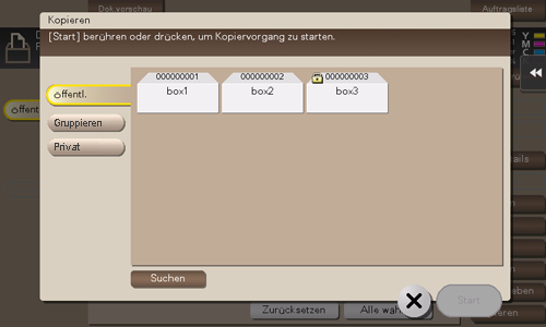 [Suchen] | Dieses Fenster wird für die Suche nach einer Box verwendet. Die Benutzerboxen werden basierend auf den Suchzeichen, die Sie bei der Boxregistrierung angegeben haben, angezeigt. Sie können auch eine Boxnummer manuell über das Tastenfeld eingeben. Tippen Sie zur Anzeige der Tastatur auf den Eingabebereich für Zahlen. |
