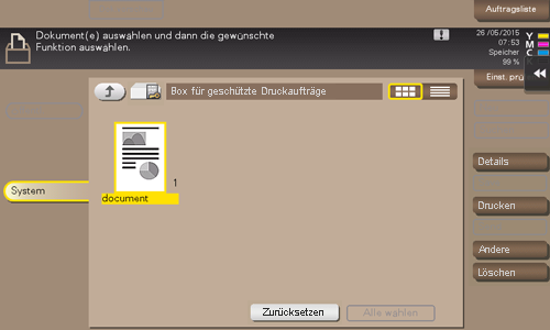 Wenn Sie ein Dokument über einen PC drucken oder die Funktion "Sicheres Drucken" im Druckertreiber auswählen, werden diese Daten in der Box für geschützte Druckaufträge gespeichert. Nachdem Sie die Box geöffnet haben, können Sie eine in der Box gespeicherte Datei auswählen und diese anzeigen, drucken, umbenennen oder löschen.