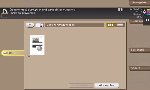 Wenn eine Faxnachricht mit der Speicherempfangsfunktion empfangen wird, wird sie in der Speicherempfangsbox abgelegt. Nachdem Sie die Box geöffnet haben, können Sie ein in der Box gespeichertes Faxdokument auswählen und dieses anzeigen, drucken, senden, umbenennen oder löschen.