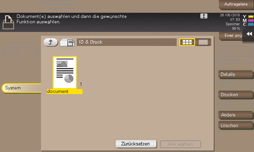 Wenn Sie über den PC ein Dokument in der Systemumgebung für die Benutzerauthentifizierung drucken, werden die Dateien mit der Code- & Druckfunktion übertragen und in der Code- & Druckbox abgelegt. Wenn sich der Benutzer, der die Druckdaten gesendet hat, an diesem System anmeldet und die Benutzerbox öffnet, kann er die gespeicherte Datei anzeigen, ausdrucken oder löschen.