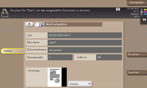 Die für den Abruf bestimmten Faxdokumente werden in der Box für Abrufübertragung gespeichert. Nachdem Sie die Box geöffnet haben, können Sie ein in der Box gespeichertes Faxdokument auswählen und dieses anzeigen, ausdrucken oder löschen.