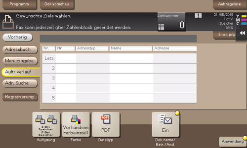 Tippen Sie auf [Auftr.verlauf], um ein Ziel aus dem Scan- oder Faxverlauf auszuwählen. Die letzten Aufträge (max. 5) werden im Verlauf angezeigt. Bei Bedarf können mehrere Ziele aus dem Verlauf ausgewählt werden.