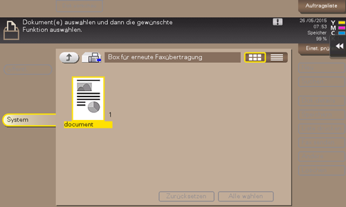 Wenn das Empfängersystem belegt ist und keine Verbindung hergestellt werden kann, werden unzustellbare Faxdokumente in der Box für die erneute Faxübertragung abgelegt. Nachdem Sie die Box geöffnet haben, können Sie ein in der Box gespeichertes Faxdokument auswählen und dieses anzeigen, ausdrucken, senden oder löschen.