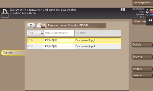 Wenn eine kennwortgeschützte PDF-Datei mit der Direktdruckfunktion oder über einen USB-Speicher ausgedruckt oder in der Benutzerbox gespeichert wird, wird die Datei in der Box für kennwortverschlüsselte PDF-Dokumente abgelegt. Nachdem Sie die Box geöffnet haben, können Sie eine in der Box gespeicherte PDF-Datei auswählen und diese anzeigen und ausdrucken. Sie können außerdem die Datei in der Box speichern oder aus der Box löschen.