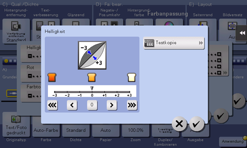 [Testkopie] | Sie können die Ausgabe überprüfen, indem Sie eine Testkopie drucken. Legen Sie das Original auf das Vorlagenglas auf. Tippen Sie dann auf [OK] oder drücken Sie die Taste Start. |