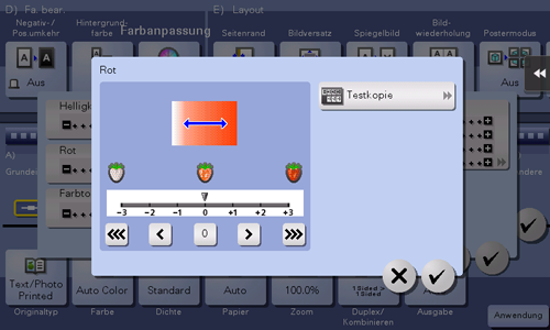 [Testkopie] | Sie können die Ausgabe überprüfen, indem Sie eine Testkopie drucken. Legen Sie das Original auf das Vorlagenglas auf. Tippen Sie dann auf [OK] oder drücken Sie die Taste Start. |
