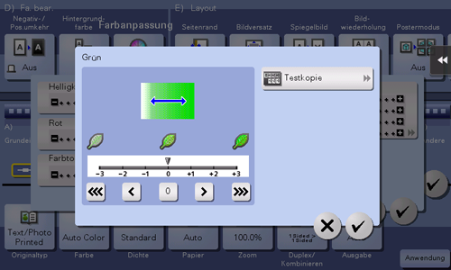 [Testkopie] | Sie können die Ausgabe überprüfen, indem Sie eine Testkopie drucken. Legen Sie das Original auf das Vorlagenglas auf. Tippen Sie dann auf [OK] oder drücken Sie die Taste Start. |