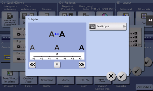[Testkopie] | Sie können die Ausgabe überprüfen, indem Sie eine Testkopie drucken. Legen Sie das Original auf das Vorlagenglas auf. Tippen Sie dann auf [OK] oder drücken Sie die Taste Start. |