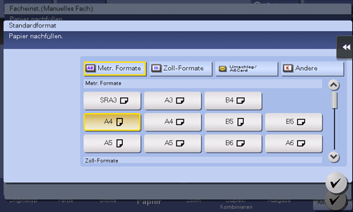 [Metr. Formate] | Wenn Sie Papier mit einem metrischen Format in die Stapelanlage/den Spezialeinzug einlegen, wählen Sie das Papierformat aus. |