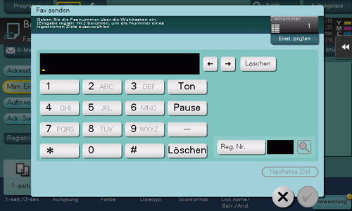 Geben Sie eine Zielfaxnummer ein, wenn gescannte Originaldaten per Fax gesendet werden. Tippen Sie bei der Verwendung von mehreren Zielen auf [Nächstes Ziel], um weitere Ziele hinzuzufügen.
