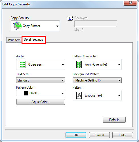 On the [Stamp/Composition] tab, select the [Copy Security] check box, and then select [Password Copy].