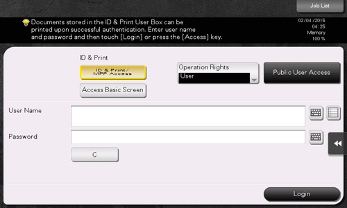 When you select [Access Basic Screen] in [ID & Print], you can log in without starting printing.
