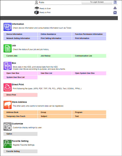 Displaying the Main Menu enables you to display the menus available in Web Connection on a single screen.
