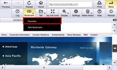 Tapping [Menu] - [Bookmark] - [Favorites] on the toolbar displays a list of favorites registered on this machine.