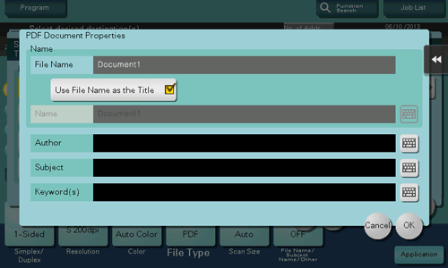 To configure PDF file properties, select [PDF] or [Compact PDF] as the file type, and tap [PDF Detail Setting] - [PDF Document Properties]. Then, configure the following settings.
