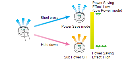 When the Power key is pressed, the status of this machine changes as shown below. Depending on how long the Power key is pressed, the state of the power save mode to be activated will differ.
