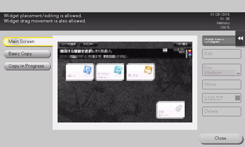 You can arrange text, icons, GIF animations, and other items as widgets at desired positions on the main menu or the copy-mode screen. By arranging widgets on frequently used screens, important information can be highlighted.