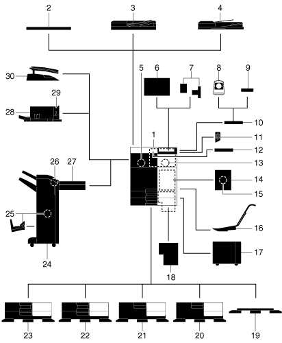28 | Finisher FS-533 | Install this unit onto the output tray of this machine. Sorts, groups and staples printed paper before outputting it. |
