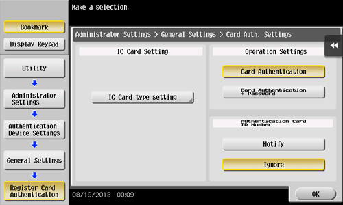 Tap [Authentication Device Settings] - [General Settings] - [Card Authentication], and configure the following setting.