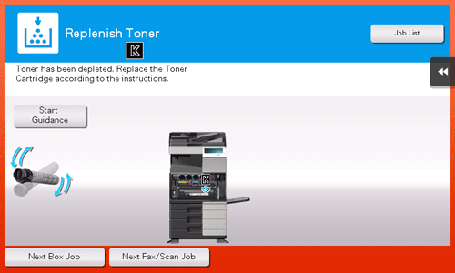 When it is time to replace a Toner Cartridge, a replacement prompt message appears. Replace it based on the maintenance contract. Tap [Start Guidance] to display the replacement procedure on the screen and check it.
