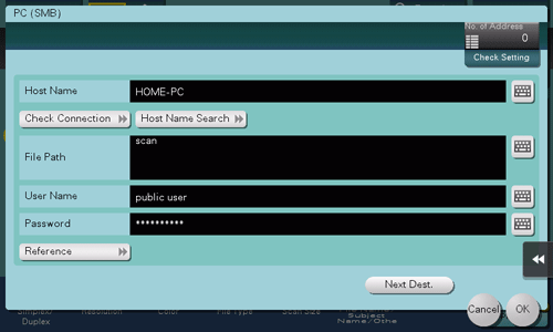 [Reference] | On the Touch Panel, search for a computer to send a file to, and select a target shared folder. When the authentication screen appears, enter the name and password of a user who has privileges to access the selected folder. After authentication, [Host Name] or [File Path] is entered automatically. The Reference function may fail under the following conditions.