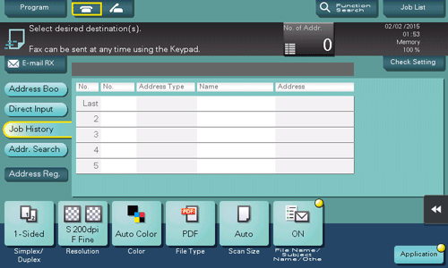 In [Job History], select a destination from the fax, scan or saved job history. The history shows the latest five fax destinations. When necessary, multiple destinations can be selected from the history.