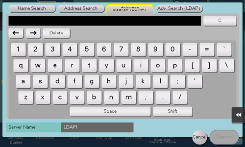 In the LDAP server or Windows Server Active Directory is used, specify a single keyword to search for an E-mail address or fax number.