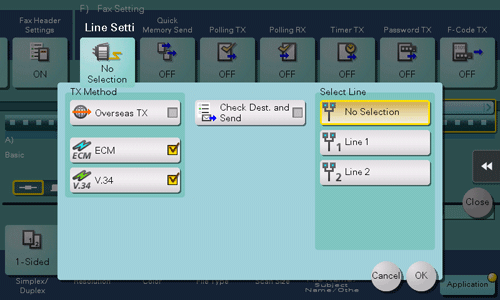 [Line Setting] | If multiple lines are used, select the line used to send a fax. In general use, use [Line 1]. If [No Selection] is selected, either line, whichever is not busy, is used for transmission. |