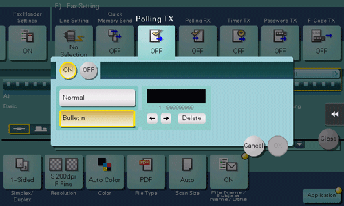 [Bulletin] | Select this option to register a file for polling in the Bulletin Board User Box. Enter the registration number of the Bulletin Board User Box you want to create using the Keypad. To display the Keypad, tap the input area for the numeral. The Bulletin Board User Box can have only one file. You can create up to 10 Bulletin Board User Boxes. They can be used depending on the intended use. |