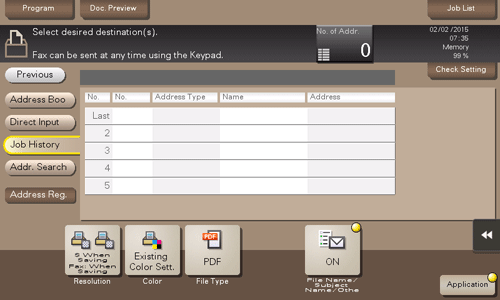 Tap [Job History], and you can select a destination from the scan or fax history. The latest jobs (up to five) are displayed for history purposes. When necessary, multiple destinations can be selected from the history.