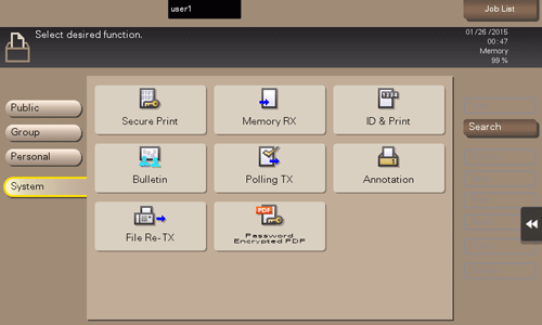 [Password Encrypted PDF] | When a password protected PDF file is printed out or stored in the User Box by using the Direct Print function or from USB memory, the file is stored in the Password Encrypted PDF User Box. Once you have opened the User Box, you can select a PDF file stored in the User Box to preview and print it out. Also, you can store the file in or delete it from the User Box. When printing or saving a PDF file, you will need to enter a password that was set for the file. |