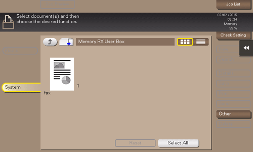 When a facsimile is received by the Memory RX function, it is stored in the Memory RX User Box. Once you have opened the User Box, you can select a fax stored in the User Box and preview, print, send, rename, or delete it.