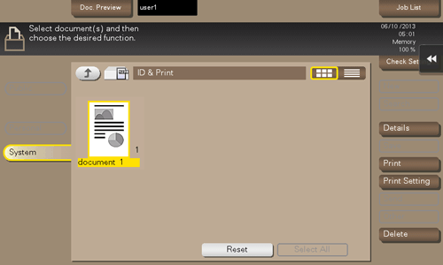When you print a document from the PC in the user authentication system environment, the files transferred with the ID & Print function are stored in the ID & Print User Box. When a user who has sent the print data logs in to this machine and opens the User Box, he/she can preview, print out, or delete the stored file.
