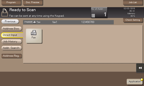 [Fax] | Enter the recipient fax number to send a fax to. When specifying multiple destinations, tap [Next Dest.] to add destinations. Tapping [Reg. No.] allows you to specify a fax destination by a registered number. |