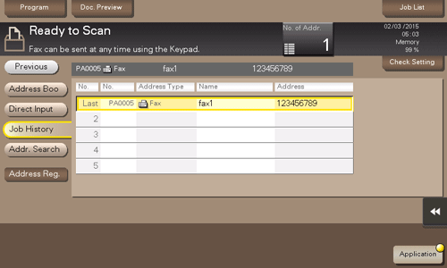 Select a destination from the Job History. The latest jobs (up to five) are displayed for history purposes. When necessary, multiple destinations can be selected from the history.