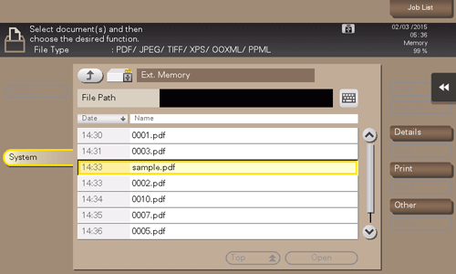 Once you have opened the User Box, you can print out a file stored on a USB memory. Also, you can read the original data and directly save it as a file in the USB memory. You can also move a file from the USB memory to the External Memory User Box.