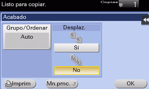 [Desplaz.] | Seleccione [Sí] al clasificar por copias o por páginas para expulsar el papel. Si se ha instalado una unidad de acabado o el separador de trabajos JS-506, las copias se expulsan y apilan una encima de otra, con cada juego de copias o páginas escalonado para separarlas. Si no se ha instalado una unidad de acabado o el separador de trabajos JS-506, las copias impresas se expulsan y clasifican según un patrón cruzado alternativo cuando se cumplen las siguientes condiciones.