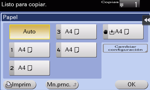 [Auto] | Toque este botón para seleccionar automáticamente el papel según el tamaño del original detectado al realizar una copia. |